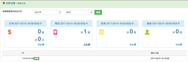 進入後台最直接可以看到的就是「訂單、電話、表單、會員」的數量,也是業主最在意的事,有沒有生意進來,